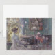 Improvisação (1899) de Childe Hassam é uma pintura vintage de retrato de impressionismo de arte fina, apresentando uma mulher tocando piano perto de uma janela aberta e flores cor-de-rosa em vasos.
