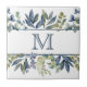 Este é um azulejo personalizado bonito, com folhas azuis e verdes de índigo e imagens de névoa fazer uma borda para o seu monograma no centro. O monograma e as imagens são colocados sobre fundo branco.