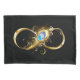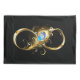 Símbolo Dourado e brilhante do infinito, decorado com pena de joalharia de pavão com turquesa sobre fundo preto.