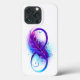 Símbolo infinito com uma bela pena pintada em cores roxas e azuis brilhantes sobre fundo branco.