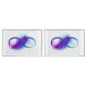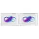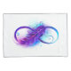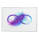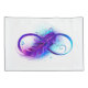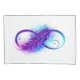 Símbolo do infinito com uma bela pena pintada em cores vibrantes roxas e azuis sobre um fundo branco.
