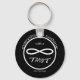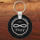 Um círculo gráfico e símbolo infinito com uma citação de Kurt Vonnegut "Tudo não é nada com uma reviravolta" em um chaveiro.