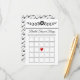Cartão de caça de chá de panela floral de flor branca e negra elegante. Mostra uma pequena flor com folhas em preto e um ouvido vermelho. O verso inclui um padrão preto e branco com flores e folhas pequenas.