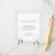 Este elegante casamento verde desejando um bom cartão é perfeito para um casamento simples. O moderno elegante design apresenta uma disposição botânica natural de eucalipto, folhas e plantas com um sutil sotaque de hortelã verde-aquarela. Personalize este cartão de convite com os seus nomes e um poema de boas intenções.