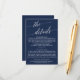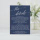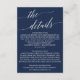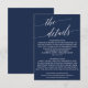 Esta elegante carta de detalhes de caligrafia de marinho é perfeita para um casamento outono. A simples design apresenta uma tipografia romântica e caprichosa sobre um fundo azul marinho.