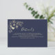 Este cartão de detalhes de casamento azul de marinho chic apresenta um trabalho de arte floral ouro elegante e um layout moderno e limpo para informações extras, como seu site RSVP, acomodações ou detalhes de recepção. Perfeito para completar seu conjunto de convites coordenado com beleza e função.