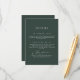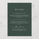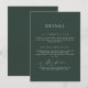 Compartilhe a agenda de casamento com esta elegante carta verde de detalhes da floresta, com uma fonte de caligrafia fluente. Este cartão é perfeito para fornecer informações completas sobre os convidados, incluindo tempos de recepção e modalidades de viagem. A cor verde da floresta profunda e o roteiro gracioso criam uma atmosfera acolhedora, garantindo que seus hóspedes estejam bem informados e prontos para curtir seu dia especial.