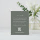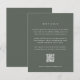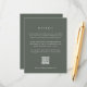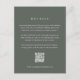 Este cartão de detalhes do casamento da coleção Timberline da Redwood & Vine Design Co. é a maneira perfeita de compartilhar informações extras com seus convidados. Com um fundo verde florestal profundo e uma tipografia branca nítida, é ideal para casamentos rústicos minimalistas, comemorações de inverno ou eventos inspirados na floresta. Inclui um espaço para um código QR ligando-se ao seu site de casamento ou página de acomodações, ajudando você a manter os convidados informados em um formato moderno e elegante.