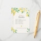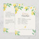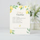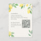 Cartão de detalhes de casamento elegante com um design de limão e folhagens em aquarela, incluindo um cronograma para o dia do casamento e código de vestimenta na frente. O verso inclui informações de acomodação e um código QR que os convidados podem escanear para acessar detalhes de viagem, confirmar presença e atualizações no site do seu casamento, tornando-o um complemento prático para o convite de casamento com tema cítrico.