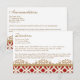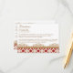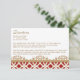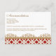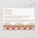 Cartões elegantes, sofisticados e bonitos de direções de casamento e acomodações inspirados em azulejos marroquinos franceses com um tom rico escarlate e vermelho rubi repetitivo e um desenho de padrão geométrico dourado e floreios florais com tom dourado. Este cartão de direções e acomodações sofisticado e luxuoso é perfeito para um casamento temático marroquino, Noites Árabes ou Aladim, festa de aniversário ou qualquer ocasião especial. O verso destes cartões personalizados e sofisticados com moldura pode ser personalizado com os nomes dos noivos no desenho com aparência de fita impressa. Arte e design Chrissy H. Studios, LLC. Todos os Direitos Reservados.