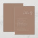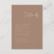 Roteiro mínimo 3.5x5, cartão de detalhes de enclausuramento. Texto branco em um fundo ferrugem neutro. Parte de uma coleção de casamento.