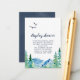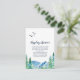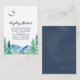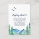 Este cartão de exposição de box de chuveiro montanha rochosa é perfeito para um chá de noiva ao ar livre ou chá de bebê. O design apresenta uma paisagem selvagem pintada em azul e verde com árvores de pinheiro em aquarela, pássaros e montanhas.