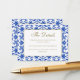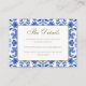 Inspirada pelos padrões italianos tradicionais, este design branco e azul foi originalmente desenhado à mão e é, portanto, exclusivo da nossa loja. Isto permite-vos efetivamente marca o vosso casamento de uma forma na moda e elegante, a partir da estética tradicional mediterrânica. Quer o seu casamento esteja em Itália, Grécia, localidades vizinhas, ou você queira simplesmente infundir esta essência na sua celebração, os nossos Cartões Azuis Italianos, ao estilo siciliano, são adaptados para isso mesmo. Eles são totalmente personalizáveis, permitindo que você os personalize para se adequar aos seus desejos. Para começar, basta clicar em 'Personalizar este modelo'. Se você está procurando por uma decoração de casamento dentro deste tema, explore nossa coleção de cheios - uma maneira fácil e agradável de preparar todos os detalhes adoráveis para seu dia especial. Se você incluir um código QR no seu site de casamento, não o torne muito pequeno e garanta que seja de boa qualidade. Sinta-se à vontade para contactar se tiver quaisquer pedidos ou consultas.