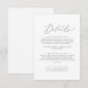 Este delicado cartão de detalhes de caligrafia prateada é perfeito para um casamento moderno. A design romântica minimalista apresenta uma magnífica e elegante tipografia de cinza prateada num fundo branco com um aspecto simples e limpo.
