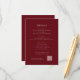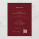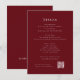 Faça uma declaração com este profundo cartão vermelho de cerimônia de casamento, que apresenta um design moderno e elegante. Ele fornece aos seus convidados informações essenciais, como acomodação, direções, um cronograma de eventos e código de vestimenta. O design e a fonte simples do cartão são visualmente atraentes e fáceis de ler. A inclusão de um código QR oferece uma maneira moderna e conveniente de os convidados encontrarem detalhes adicionais no seu site de casamento. Personalize esta modelo elegante para criar uma adição memorável e funcional à sua papelaria de casamento.