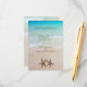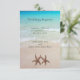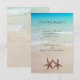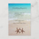 Mar e areia, dois cartões de registro de casamento de estrelas-do-mar. A água do oceano azul é o pano de fundo para informações de armazenamento a serem incluídas com chás ou convites para festas de noivado.