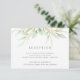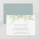 Projetado para combinar com nossa coleção de casamento botânico arejado, este cartão de recepção verde e branco apresenta um spray de folhagem verde pastel e folhas, com os detalhes da recepção, horário e endereço.