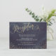 Design de caligrafia com letra dourada e confetes de pontos dourados em fundo aguado de céu naval escuro, efeito brilhante de dourado metálico falso, moderno, chique, limpo e elegante, perfeito para casamento vintage ou casamento de inverno à noite. Personalize seu próprio cartão de recepção para o conjunto de convites de casamento.