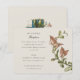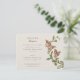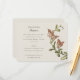 Esta recepção de casamento é uma bela extensão da suíte de convites para o casamento, com uma rica elegância botânica. O lado frontal apresenta um par de papagaios carinhosamente rendidos, suas penas detalhadas em tons vibrantes de oliva, esmeralda, e um toque de azul-marinho, empolgado em meio a um spray de flores delicadas em pêssego mole, blush e tons brancos cremosos. O bege quente do fundo oferece uma canvas neutra que destaca o oval azul marinho monograma, adicionando um toque personalizado ao design. O verso da carta continua o tema botânico, com uma graciosa ilustração de flores e folhas, sugerindo uma atmosfera festiva e romântica para a recepção. A elegante tipografia anunciando os detalhes da recepção adiciona ao charme clássico do cartão, convidando convidados para uma noite de janto, dança e alegria.