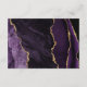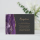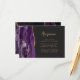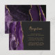 A borda esquerda deste elegante cartão de recepção de casamento moderno apresenta uma borda de ágata em aquarela roxa aparada com brilho dourado falso. O título está em script de escrita manual moderna, com o texto personalizável abaixo em fonte sans serif dourada sobre um fundo preto de ardósia. O verso apresenta um design de ágata roxa e dourada correspondente.