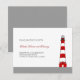 Cartão de recepção de casamento moderno e elegante. Apresenta um farol tradicional em preto, vermelho e branco com uma borda cinza na parte inferior. Ótimo para um casamento a ser celebrado em um farol, praia, costa, mar ou local histórico. Use-o para um grande evento ou uma cerimônia íntima. CONTATE “MARLENEDESIGNER” SE DESEJA ALTERAR A COR OU O TEXTO DESTE DESIGN.
