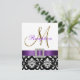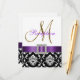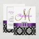 A elegância sofisticada é transmitida por este lindo design de convite de recepção de casamento. Um padrão floral damasco preto e branco serve de fundo para um efeito de foto da inicial metálica em dourado M e uma fita de cetim roxa e broche de diamante TUDO IMPRESSO EM UM CARTÃO PLANO. Uma maneira perfeita de convidar seus convidados para a recepção de casamento. Padrão damasco contemporâneo, porém clássico, com um design que permite personalizar a frente com seus nomes ou a palavra "recepção" e o verso é livre para adicionar o texto personalizado do convite de recepção de casamento. O convite de recepção de casamento é definido para a inicial do monograma "M". Para outras letras ou cores de fita ou damasco, entre em contato com o designer em luxuryweddinginvitations@gmail.com. Design do layout por Elke Clarke©. Gráficos licenciados. Além disso, escolha entre uma variedade de