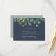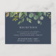 Projetado para combinar com nossa coleção de casamento Bosque de Eucalipto, este cartão de recepção botânico exuberante apresenta um spray de folhas em aquarela e folhagem verde de eucalipto, destacando os detalhes da recepção, horário e endereço, em branco sobre um fundo azul-naval fumê.