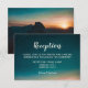 Elegante cartão de modelo de recepção de casamento. O fundo é uma bela fotografia de um céu noturno azul turquesa escuro com uma galáxia de estrelas na frente e um nascer do sol sobre montanhas no verso. Todo o texto é totalmente personalizável, em uma combinação elegante de fontes.