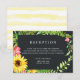 A frente do cartão é decorada com uma moldura de girassol com toques de flores rosa e folhagens em um fundo escuro. Edite todo ou parte do texto. Este cartão também pode ser um cartão de "Detalhes" ou "Informações" se preferir, basta alterar a palavra "Recepção". A parte traseira do convite tem um padrão de listras em aquarela amarelo claro. Este cartão combina com uma coleção em minha loja.