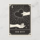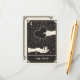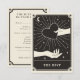 Este cartão Boho Save The Date apresenta um design de estilo de carta de tarot celestial numa paleta de cores preta e creme. A ilustração mostra uma mão segurando um coração. O fundo tem uma lua e estrelas cintilantes. Isso seria perfeito para qualquer pessoa que tenha um casamento temático de Halloween ou Assustador com um tema de leitura de palma ou adivinhação.