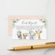 Cartão de solicitação de livro de chá de bebê de animais safari de menina doce com quatro animais da selva, alguns arranjos florais rosa e algumas folhagens.