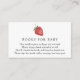 Um cartão de solicitação de livro para chá de bebê. Com morango em aquarela e poema: "UM PEQUENO PEDIDO, ESPERAMOS QUE NÃO SEJA MUITO DIFÍCIL POR FAVOR, Traga UM LIVRO EM VEZ DE UM CARTÃO ELES VÃO ADORAR O LIVRO, MUITO AMADO OU NOVINHO POR FAVOR, ASSINE O INTERIOR COM UMA MENSAGEM SUA!"