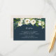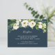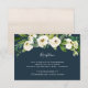Projetado para coordenar com a nossa coleção de casamento Alabastro, este novo cartão de recepção botânica verde e azul-marinho apresenta um spray de verde-aquarela e flores brancas tocando seus detalhes, local e cronometragem da recepção de casamento.