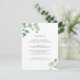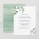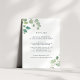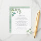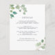 Projetado para combinar com nossa coleção de casamento floral de aquarela de eucalipto, este cartão botânico elegante apresenta sprays de folhas de eucalipto pintadas à aquarela em torno dos detalhes do seu casamento. Use os campos do modelo para adicionar informações importantes para seus convidados, incluindo arranjos de hotel, estacionamento, brunch pós-casamento ou site do casamento.