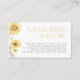 Sutil e sincero, este cartão de gabinete convida os hóspedes a contribuírem com uma receita carinhosa em vez de uma carta tradicional — criando um presente pensativo e duradouro para a noiva. O motivo girassol e a suave escrita estilhaçando o carregar através do tom alegre e natural do evento, enquanto o padrão de coordenação reversa adiciona um acabamento de designer. Uma inserção perfeita para convites, bolsas favoráveis ou mesas de boas-vindas. Combinando cartões de receita, aglutinantes e acessórios de coordenação disponíveis mediante solicitação. Copyright Anastasia Surridge, todos os direitos reservados.