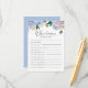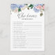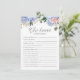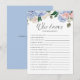Quem conhece melhor a noiva? Cartão azul de chá de panela floral com ilustrações aquarelas de hydrangeas azuis, rosas brancas, rosas cor-de-rosa e verde. Personalize adicionando nomes, eventos e datas. Este cartão de teste floral é perfeito para chás de panela e festas de casamento.