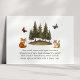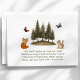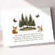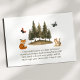 O cartão de indicação "Livros de Animais da Floresta para Bebê" integra elementos da natureza de forma encantadora na celebração do chá de bebê. Ele apresenta uma cena encantadora em aquarela com um esquilo, raposa e borboletas voando, aninhados entre um bosque de árvores sempre verdes. Este cartão convida cuidadosamente os convidados a trazer um livro em vez de um cartão, sugerindo títulos queridos ou novos para ajudar a construir a primeira biblioteca do bebê, tornando-o um complemento significativo para a celebração.