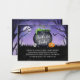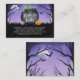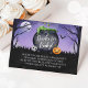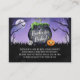 Aproveite este chá de fraldas assustador do Dia das Bruxas para o cartão de bebê em nosso Bebê está criando a coleção de chás de fraldas temáticos. A design apresenta um céu noturno púrpura assustador com árvores assustadoras, uma lua de cheio, um caldeirão borbulhante com morcegos, abóbora e crânio.