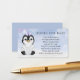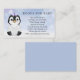 Um cartão de inserção de solicitação de livro para o chá de fraldas. Apresentando pinguim de aquarela com poema: "UMA PEQUENA SOLICITAÇÃO, ESPERAMOS NÃO MUITO DURO POR FAVOR TRAZER UM LIVRO EM VEZ DE UM CARTÃO QUE ELES CHERARÃO O LIVRO, BEM AMADO OU MARCA NOVO POR FAVOR ASSINE O DENTRO COM UMA MENSAGEM DE VOCÊ!"