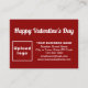Feliz dia do Namorados! Um feriado adorável para comemorar este fevereiro e anunciar também seu negócio ou promover seu nome de marca. Cartão de gabinete que você pode personalizar para colocar sua marca comercial e com saudação do dia do Namorados. Personalize-o e use-o para saudar seus clientes ou clientes neste dia de Namorados e como material de marketing para anunciar sua empresa ou promover seu nome de marca. Você também pode usá-lo como acessório do material de embalagem do seu produto. Placa de gabinete personalizável que você pode usar para criar reconhecimento de nome de marca. As cores design são textos brancos sobre fundo vermelho. Para personalizar esta placa de gabinete, carregue o logotipo da sua empresa, digite seu nome, endereço, número de telefone, e-mail e site ou a página de mídia social da sua empresa. Verifique a aparência nos lados frontal e traseiro após carregar o logotipo e os textos de digitação. Se a aparência lhe agrada, você pode colocar seu pedido agora. Se você precisar redimensionar e mover o logotipo e os textos para o ajustado nesta placa de compartimento ou no tamanho que você escolherá, mude na ferramenta design. Você também pode alterar a cor do plano de fundo, a cor da fonte e o estilo da fonte na ferramenta design. Feliz dia do Namorados! Desejando mais vendas neste feriado.