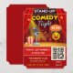 Traga o riso antes mesmo do show começar com este convite de ingresso para uma noite de comédia stand-up. Projetado em um estilo arrojado de teatro com cortinas de palco vermelhas, ilustração de microfone e elementos cômicos divertidos, este convite captura perfeitamente a atmosfera divertida de uma apresentação de comédia ao vivo.
