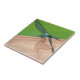 A pintura de uma libélula azul sentada sobre um trilho de madeira é impressa em azulejos cerâmicos. Eles podem ser adicionados a um quadro e/ou a uma caixa de presentes.