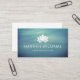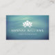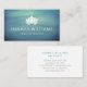 Cartões de visitas horizontais elegantes para estúdios de ioga, instrutores de ioga, spas ou profissionais de bem-estar. Este cartão apresenta uma flor branca de lótus sobre um fundo azul sutil e verde tonado com ondas de calmação.