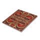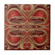 Design simétrico com padrões intrincados em tons dourados num fundo vermelho profundo. Os elementos decorativos são linhas curvas e espirais que se entrelaçam, criando uma estética rica e sofisticada. O estilo ornamental lembra a arte clássica com foco na elegância e no detalhe tridimensional.