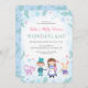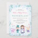 Tão bonitinho como a Alice de inverno em Wonderland, tema de inverno, convites para bebês! Esta adorável design apresenta uma Alice, o Mad Hatter, o Coelho Branco, e o Cheshire Cat numa terra maravilhosa de inverno, todos do clássico livro de Lewis Carroll.