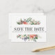 Concebido para combinar com a nossa coleção de casamento floral em aquarela Mystical Winter, rodeado por delicadas flores de inverno pintadas, poinsettia e pinhas e colocado sobre um fundo branco, este design é atraente e muito bonito. O cartão moderno e simples de "salve a data" aparece no centro entre a folhagem e um modelo de cartão postal está no verso. Todo o estilo de texto, cores e tamanhos também podem ser modificados para atender às suas necessidades