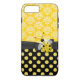 Capa elegante para iPhone 7 Plus, com um padrão damasco amarelo e branco, na parte superior da capa e um padrão de bolinhas amarelo no preto, na parte inferior. Gráficos de uma fita preta e laço cruzam a capa entre os dois fundos e são decorados com gráficos de uma joaninha amarela e preta. Uma maneira bonita de proteger seu iPhone 7 e também ficar elegante, e é uma ótima ideia de presente.