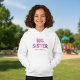 Moletom de irmã mais velha personalizada. Tipografia em negrito escrevendo irmã mais velha em rosa e roxo. O design é personalizado com um nome personalizado. Design adorável para presentear uma irmã mais velha, fazer com que ela se sinta especial e mostrar amor pelo(s) seu(s) irmão(s) mais novo(s).