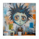 Um personagem colorido com olhos grandes e expressivos e cabelos pontiagudos adornados com objetos circulares. Por trás da figura, o fundo está cheio de rabiscos como o grafite, justapessionando o caos urbano com o personagem