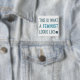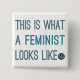 "É assim que se parece uma feminista" está em letras finais com a palavra "feminista" num aqua mais ousado. A frase é terminada com um período facial. O truque é que qualquer um pode vestir. É divertido quebrar estereótipos. Quer esteja ou não quebrando estereótipos, mostre às pessoas quem você é. Sorria! Feminismo deveria fazer você feliz. :) Ou não. Que nunca.